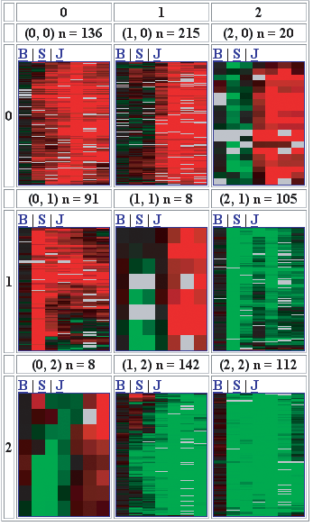 Self-organizing maps (or SOMs) were developed by Tuevo Kohonen in the 1980s and have since been used to analyze microarray data. The implementation of SOMs in PUMAdb allows the data to be separated into partitions that are aranged in a two-dimensional grid. For example, Figure One shows a 3 x 3 map with nine partitions. Notice that each partition is more similar to its neighbors than it is to the partitions that are farther away. The implementation of SOMs in PUMAdb has several steps: initialization of the SOM, refinement of the SOM, partitioning of the genes, and hierarchical clustering of each partition.